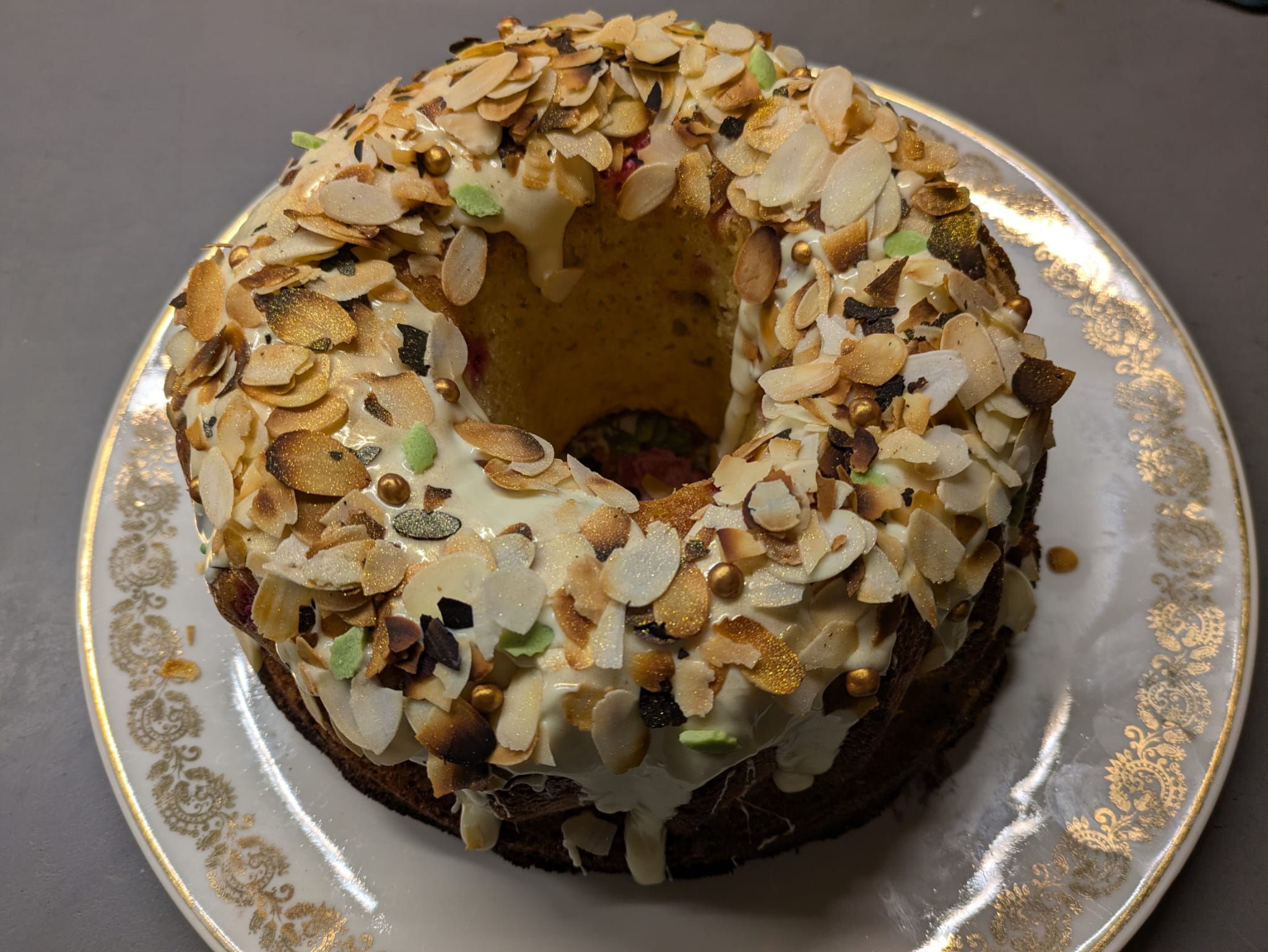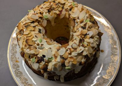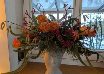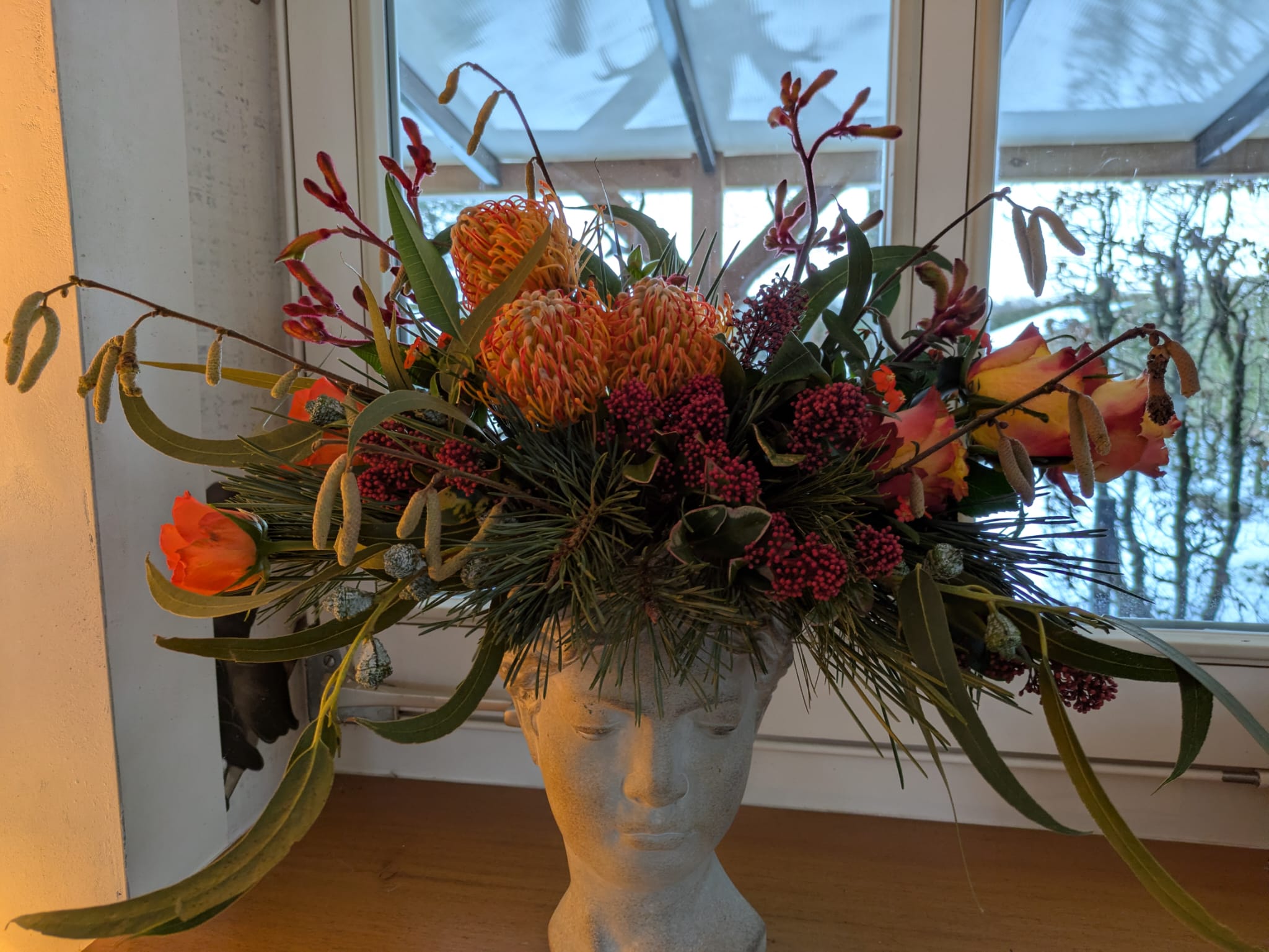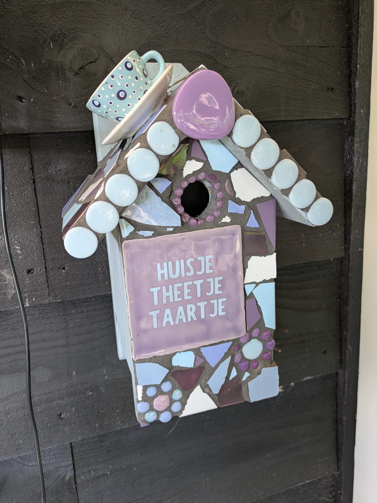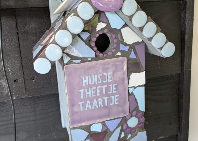 Verder heb ik tijdens de afgelopen Kerst een echte klassieke tulband gebakken met verse cranberries. Goed gelukt en de familie heeft ervan gesmuld. Afgelopen weekend heb ik een bloemstuk gemaakt in een hoofd dat open is bovenop. Gezellig, even wat kleur binnen. Ik maak zo af en toe nog een vogelhuisje. Kortom vervelen doe ik me niet maar dat neemt niet weg dat ik blij ben als de theetuin weer open is. Ik ga nu af en toe iets op de website zetten zodat jullie weten waar ik mee bezig ben.